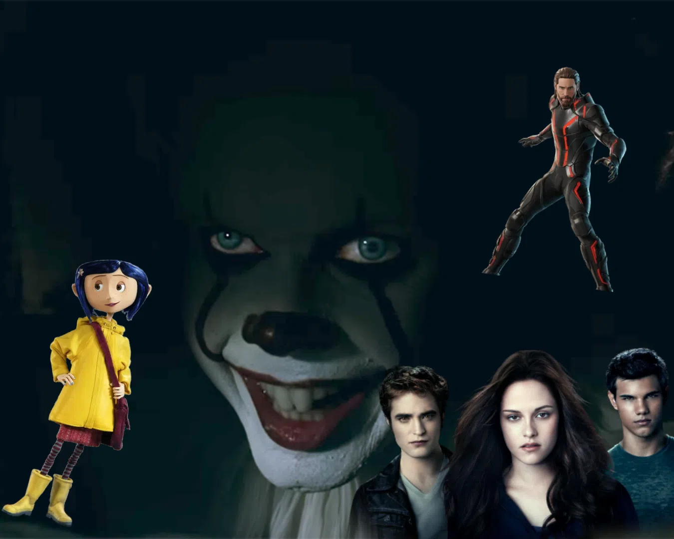 Characters from some of the top fall movie picks, including Coraline, Pennywise, and the cast of The Twilight Saga. (Graphic created by Aaliyah Drissi, October 2025)